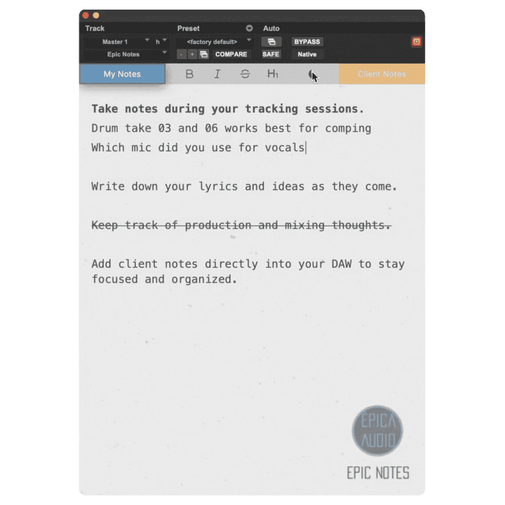 Epic Notes is your creative companion inside the DAW — a simple, lightweight notepad plugin designed to keep your ideas, lyrics, mix notes, and session details organized without disrupting your workflow. Whether you’re jotting down song ideas, tracking takes, or planning mix revisions, Epic Notes keeps everything right where you need it. Perfect for producers, songwriters, and engineers, it brings focus, structure, and creativity together in one intuitive tool so you never lose a great idea again.
